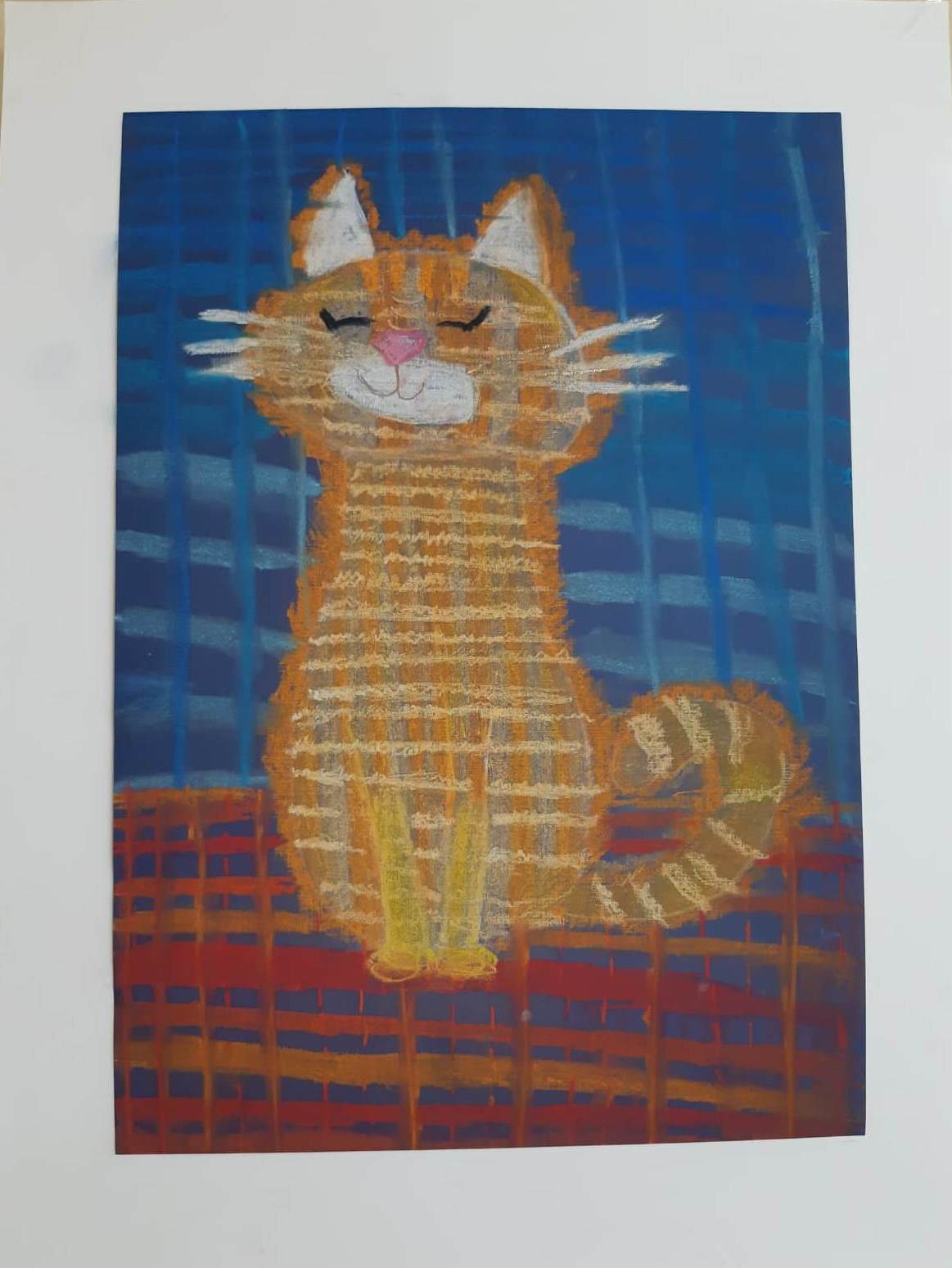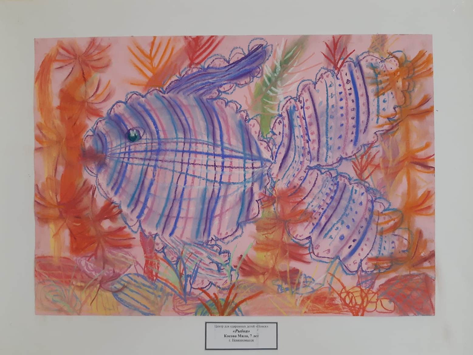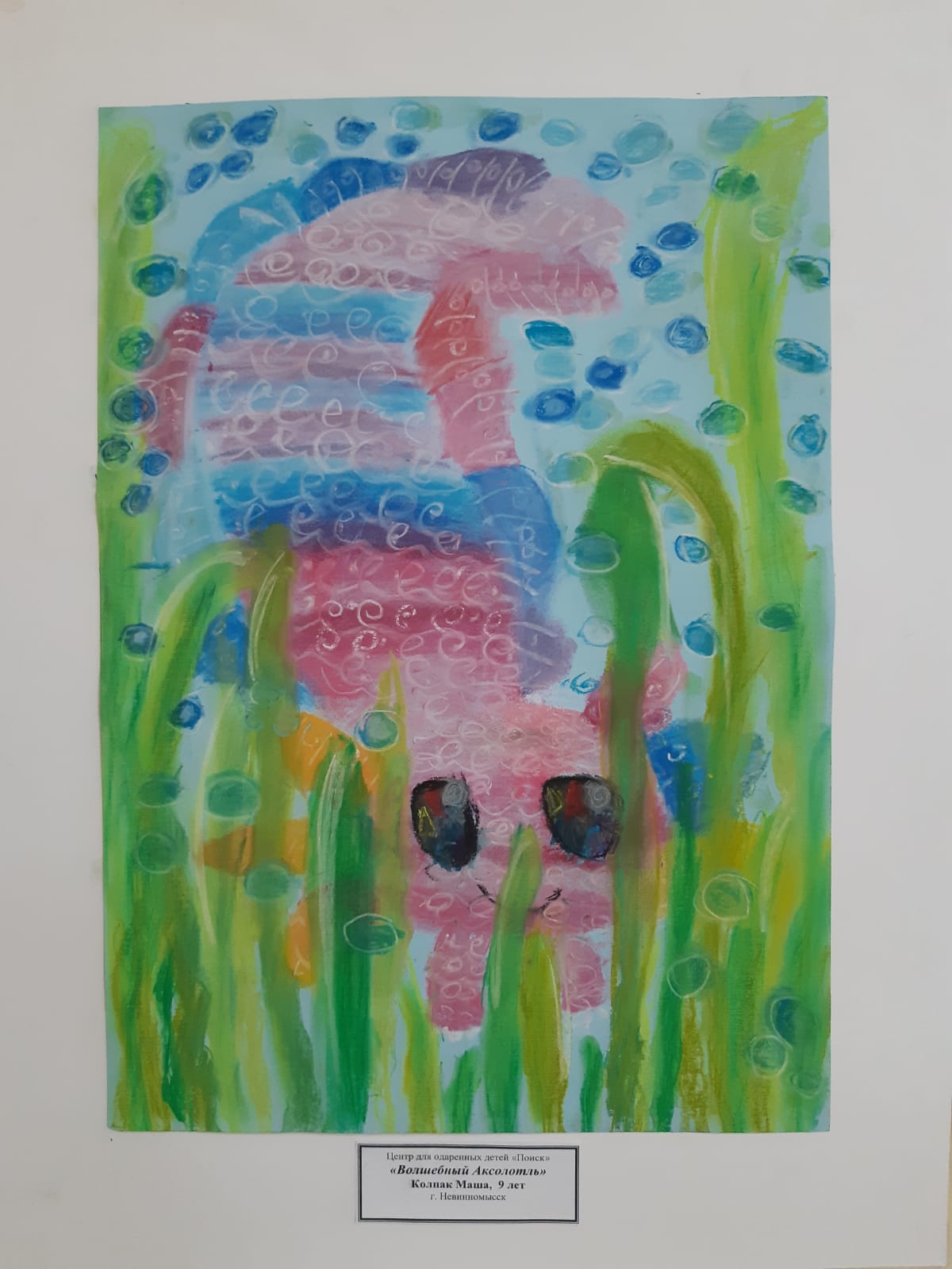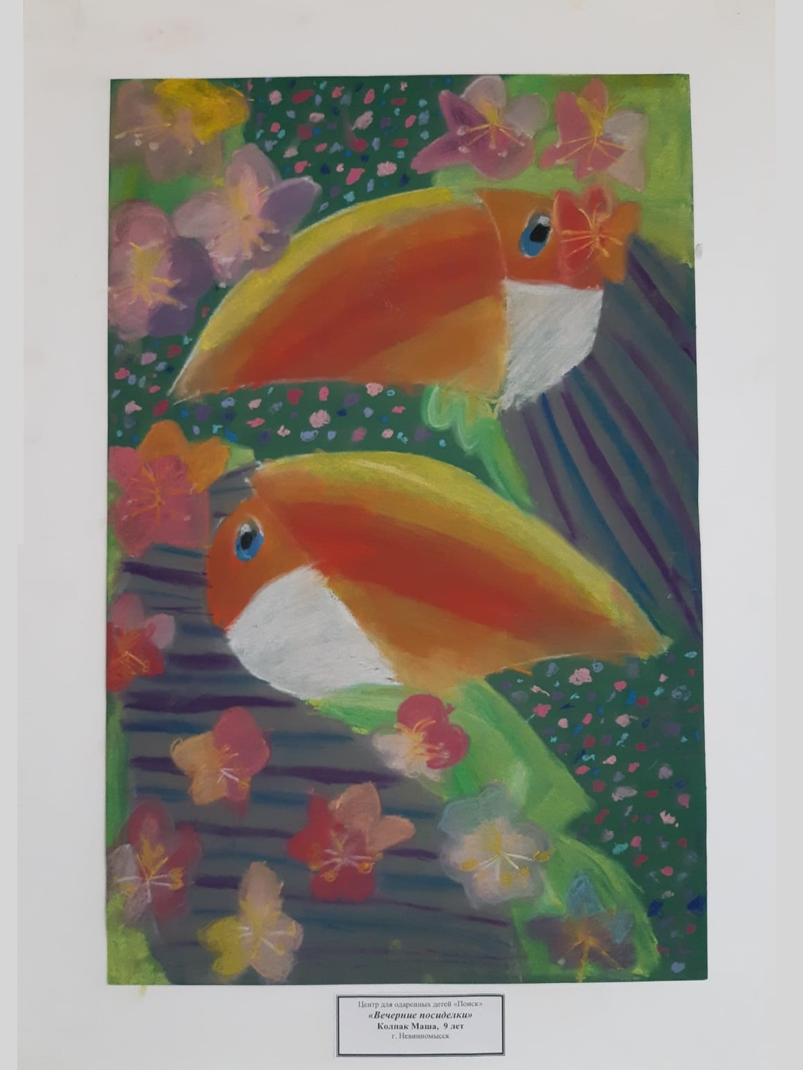 На выставке также представлены работы в технике «сухой» пастели. Необыкновенная нежность пастельных переходов помогает нашим художникам создавать замечательные рисунки. Использование тонированной бумаги позволяет делать гармоничные композиции в цвете. «Котик» Колпак Маши притягивает взгляды зрителей своим невозмутимым спокойствием и доброжелательностью. А ее «Вечерние посиделки» двух экзотических ярких птиц и «Волшебный Аксолотль» подтверждают не только хорошие знания основ техники пастели и профессионализм юной художницы, но и кругозор в области животного мира. С ней рядом эффектно и достойно смотрятся композиции Проворовой Софии «Павлин» и Косовой Милы «Рыбка». Юные художницы впервые в этом году познакомились с этим прекрасным художественным материалом.