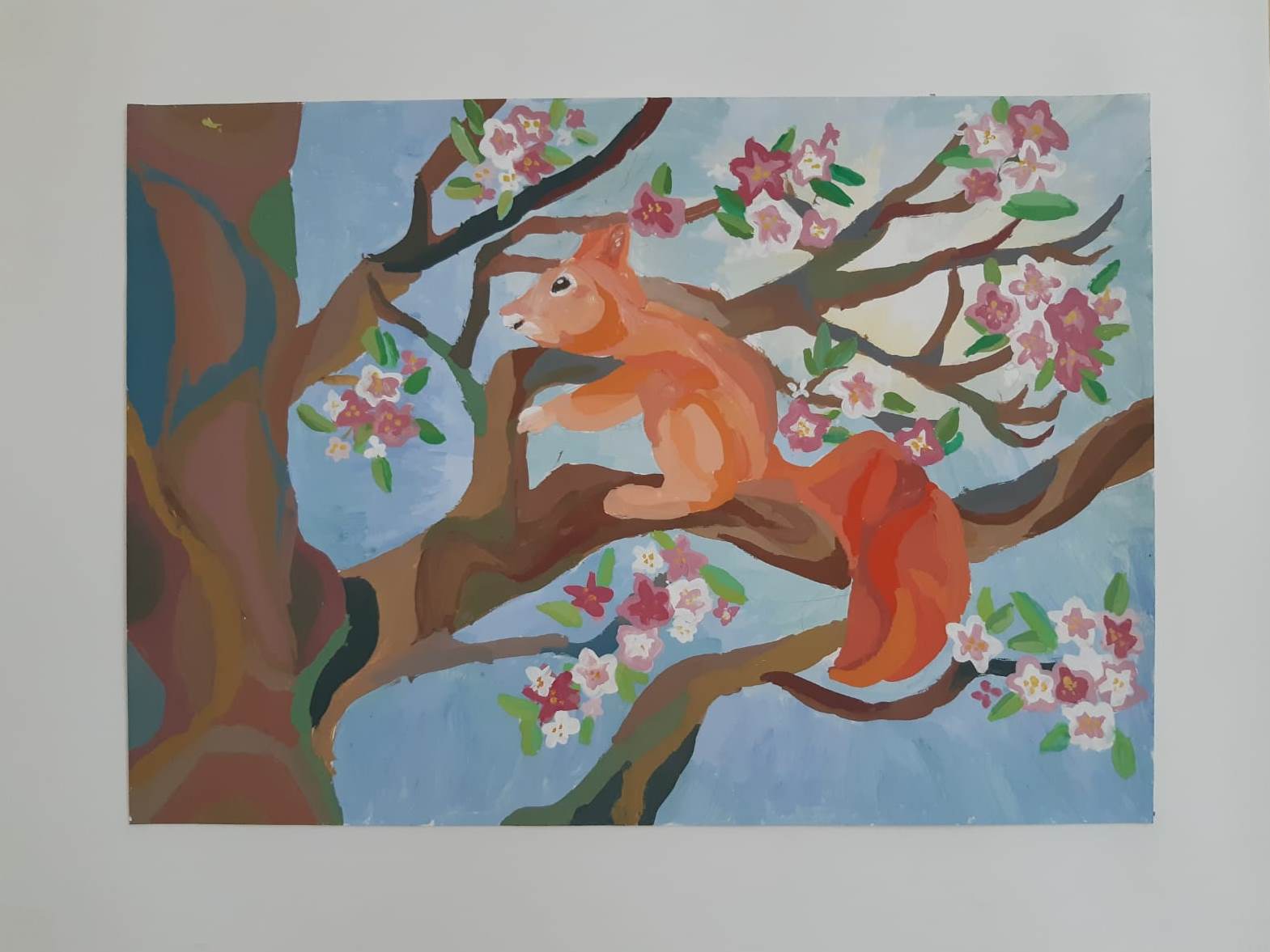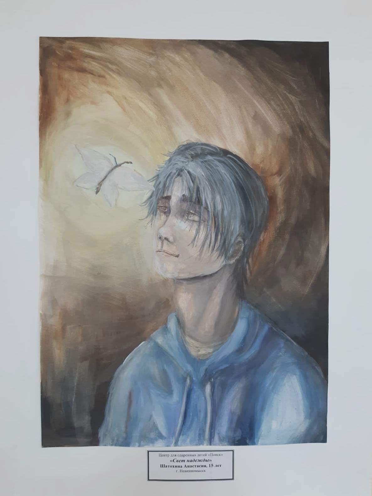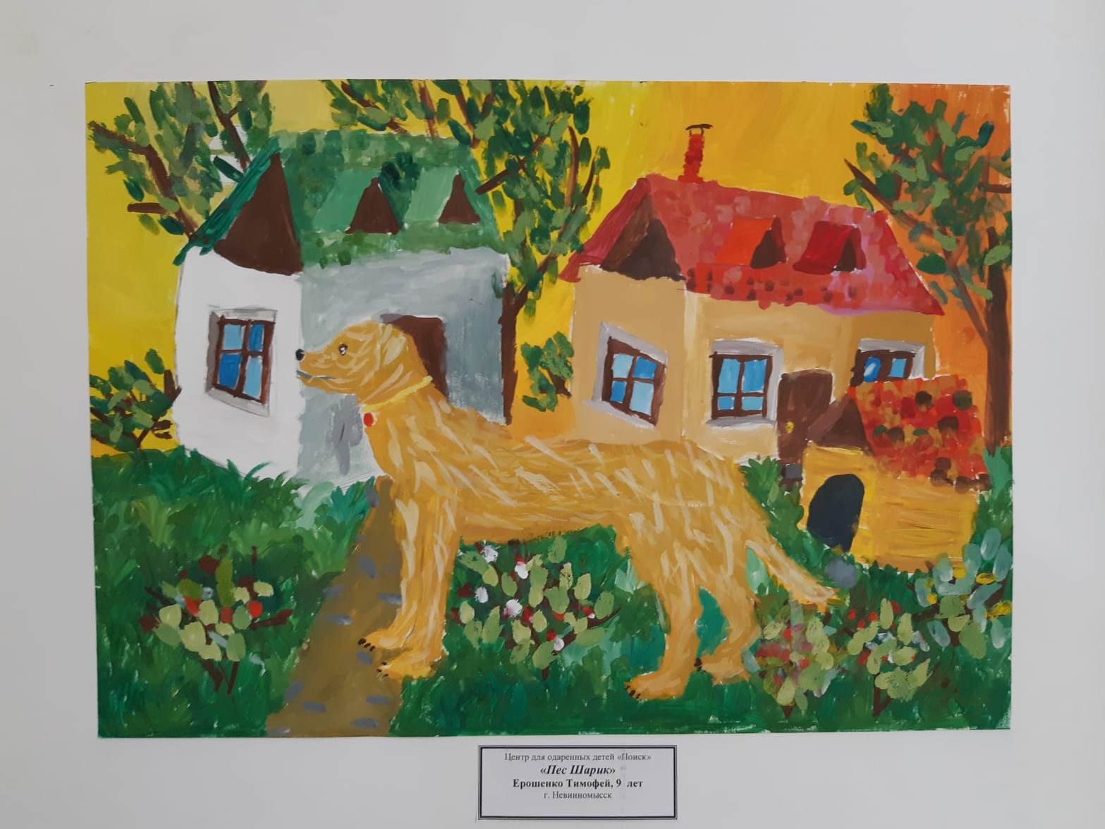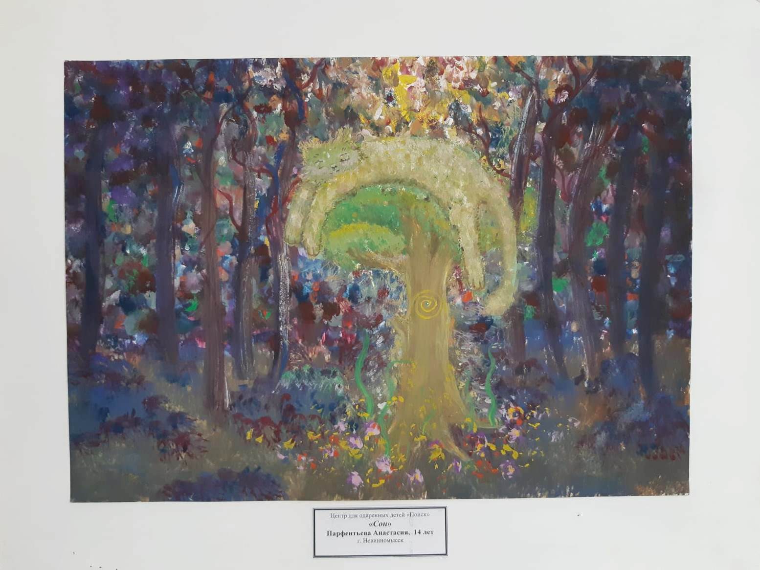 У каждого зрителя есть возможность остановиться, посмотреть и задуматься о названии и смыслах картины. Прекрасный мир красок, радости и света можно увидеть в работах детей. «Свет надежды» - так и называется центральная композиция Шатохиной Анастасии. Тему картины-размышления продолжает еще одна замечательная юная художница Парфентьева Анастасия в своей композиции «Сон». Цветовой колорит завораживает зрителя и погружает в какой-то неведомый и фантастический мир. А путь к этому миру шел через внимательный анализ того, что мы видим рядом. Так появились работы «Пес шарик» Ерошенко Тимофея, «Олененок» Марковой Полины, «Касатка с малышом» Цымбаловой Валерии, «Жираф на рассвете» Прошиной Варвары, «Пес Барбос на неизвестной планете» Паниной Ульяны.